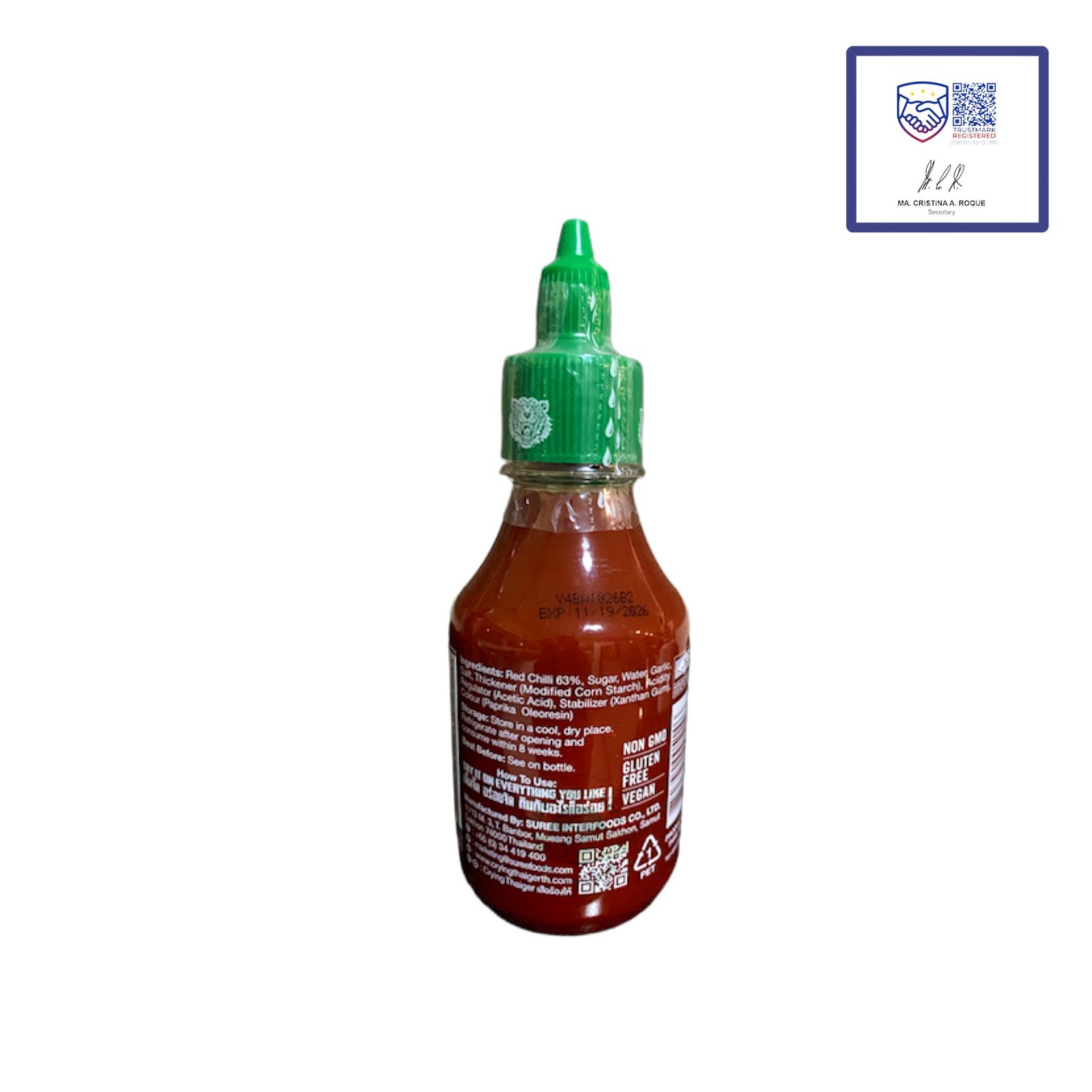 Ingredients: water, red chilli, sugar, garlic, salt, xanthan gum, modified corn starch, acetic acid, paprika oleoresin colour.